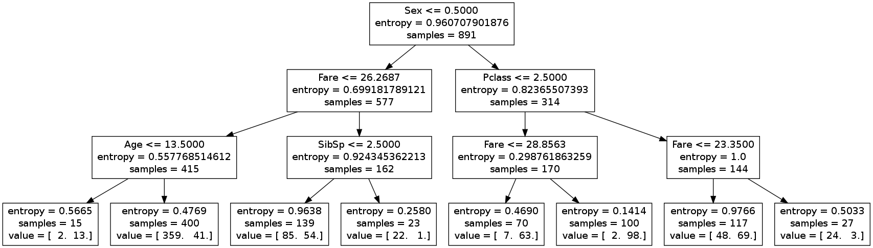 A full explanation of the tree will be given later. Here just look at the desion rules (first line of the inner nodes) and at the last line of the leafs. In each leaf you see a array with counts of the different targets (train data): [number_died number_survivors] .